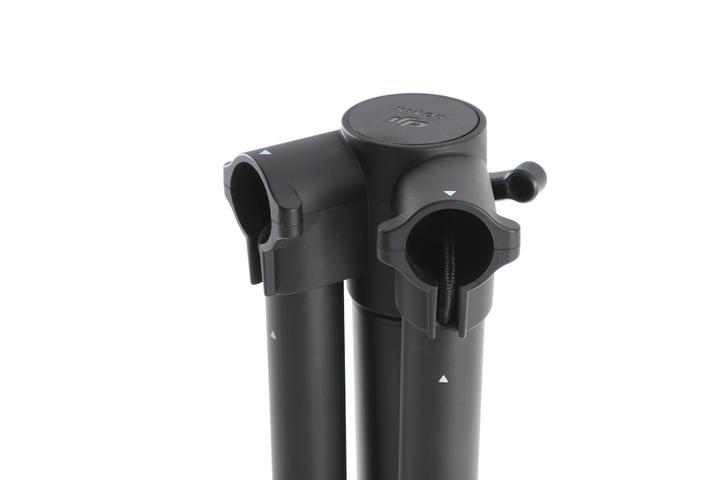 Подставка оснащена складными ножками и выдвижной вертикальной опорой, необходимой для регулировки высоты, сдвигаемой в режиме хранения