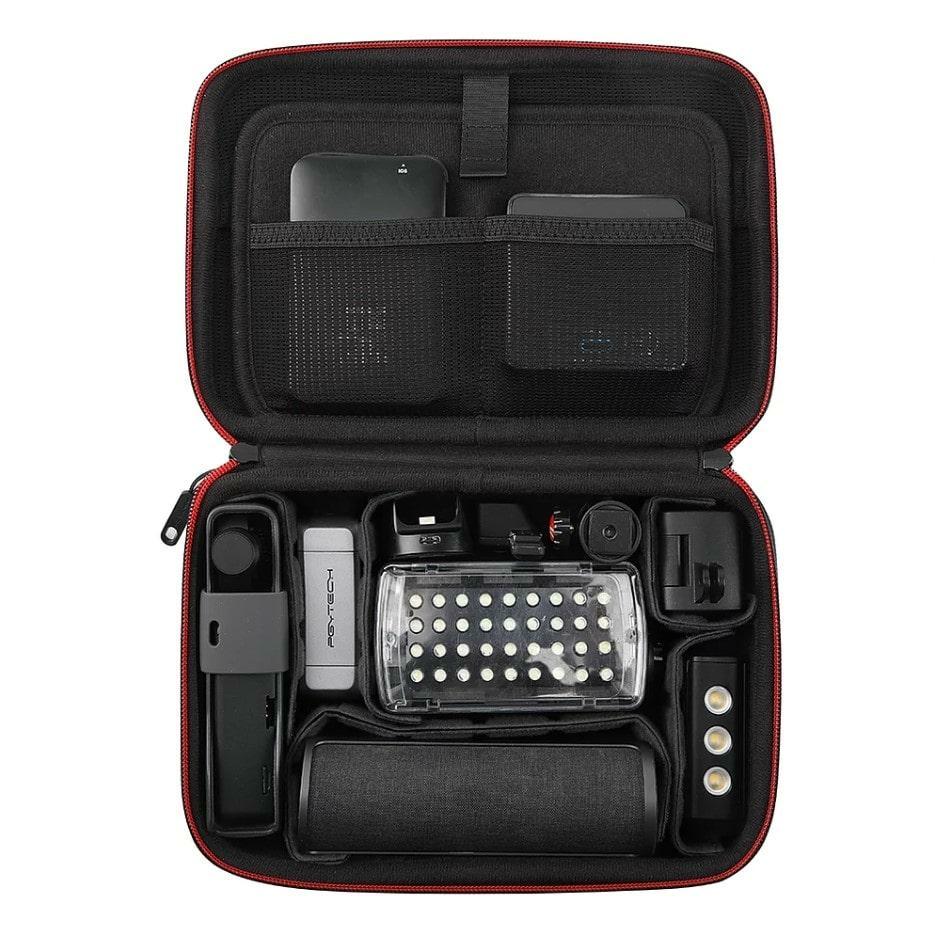Кейс для переноски OSMO Pocket PGYTECH Mini Carrying Case может вместить OSMO Pocket и несколько аксессуаров. Он включает в себя два длинных и четыре коротких складных перегородки, которые помогают организовать область хранения. Сумка покрыта прочной водонепроницаемой оболочкой из нейлоновой ткани